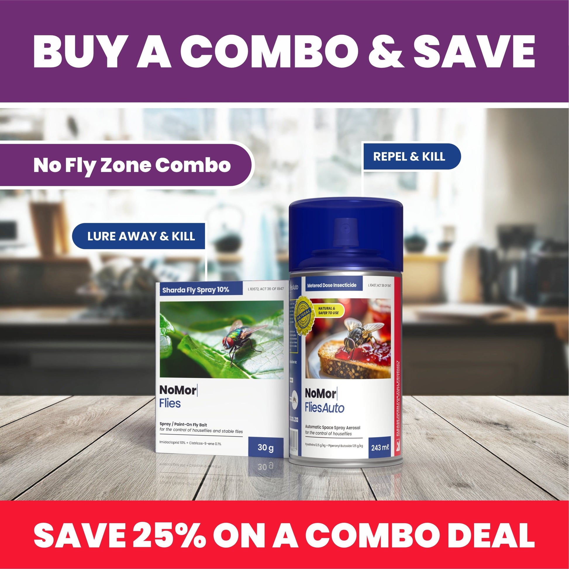 NoMor Flies (Sharda Fly Spray 10%) 30g: A versatile spray or paint-on bait designed to lure and eliminate houseflies and stable flies. Perfect for outdoor areas, this bait offers targeted control to stop flies at their source.